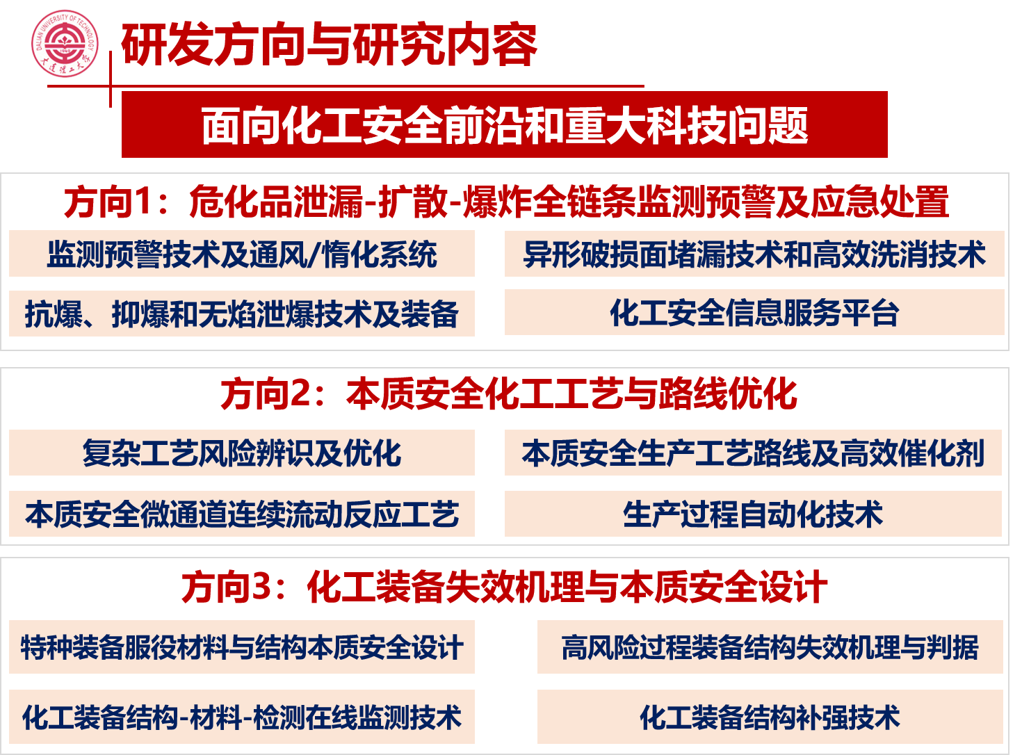 实验室面向国家战略和国防装备发展需求,开展前沿性、引领性、颠覆性研究,以发展风险监测预警、应急处置技术装备、本质安全化工工艺、化工装备失效机理与本质安全设计方法为主要研究方向,以支撑国家经济社会持续稳定发展、促进带动辽宁老工业基地改造与结构调整、提升化工本质安全生产工艺和智能应急处置技术为目标和动力。实验室主要研发方向和研究内容包括: