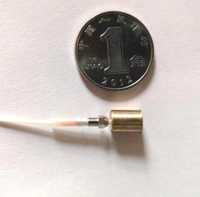 为充分发挥全光学光声光谱的本质安全和可远距离测量优势,设计了一种如图3所示的用于气体微泄漏监测的光纤光声传感系统(Fiber-optic photoacoustic sensor for remote monitoring of gas micro-leakage. Optics Express, 2019.),探头中气室体积仅为70 μL,对C2H2的检测极限达到ppb量级。本技术方案实现了光声检测单元和油气分离单元的一体化,光声激发光和探测光均采用光纤传输,不仅使光声气体传感探头具有电磁免疫特性,还可以实现远距离光纤遥测。最新设计的单光纤光声气体传感器的气室体积仅仅10μL,实物图如图4所示。