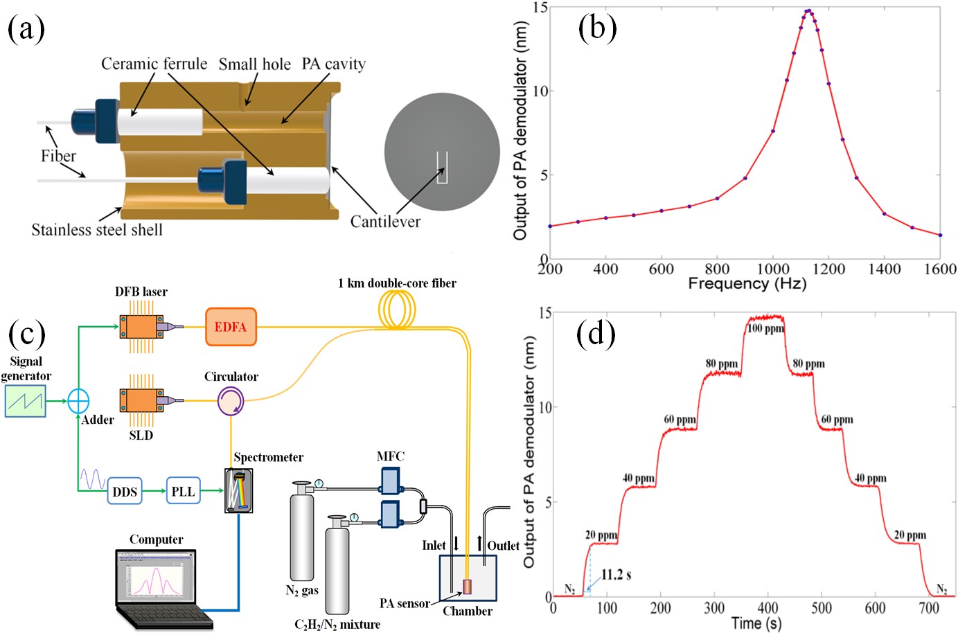 图3 (a)光纤光声探头结构示意图;(b)光纤光声探头的频率响应;(c)气体微泄漏遥测实验系统示意图;(d)连续测量不同浓度乙炔的实验结果