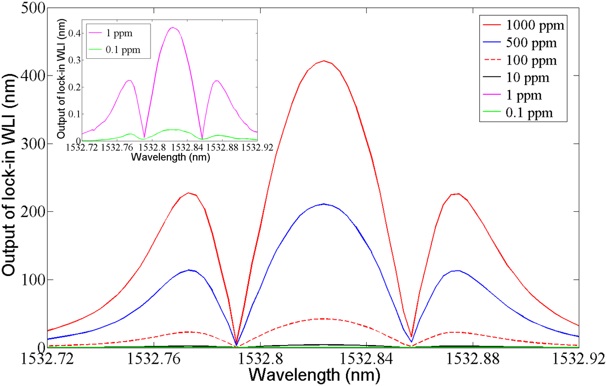 在基于光纤声波传感器的光声光谱研究方面,本项目组设计了基于Parylene-C膜光纤声波传感器的多组分光声光谱系统,对CH4、C2H6、C2H4、C2H2、CO和CO2等6种气体的检测了灵敏度分别达到0.21ppm、0.13 ppm、0.16 ppm、0.11 ppm、0.15 ppm和0.48 ppm(Photoacoustic spectroscopy based multi-gas detection using high-sensitivity fiber-optic low-frequency acoustic sensor. Sensors and Actuators B: Chemical, 2018, 260: 357-363.)。本人在近期提出了一种光纤悬臂梁增强型共振光声光谱方案(Research on fiber-optic cantilever-enhanced photoacoustic spectroscopy for trace gas detection, 2017 International Conference on Optical Instruments and Technology: Optoelectronic Measurement Technology and Systems. International Society for Optics and Photonics, 2018, 10621: 1062108.),采用光纤悬臂梁声波传感器对1.4kHz光声信号的高灵敏探测,结合干涉-强度解调法,系统对NH3的检测灵敏度达到3ppb。在此基础上设计了如图7所示的痕量C2H2检测系统,结合快速光谱解调法,测量的不同浓度C2H2气体的二次谐波信号如图2所示,系统在200s测量时间下对C2H2的极限灵敏度达到80ppt,比前期实验结果提高了1个数量级(Chen K, Yu Q, Gong Z, et al. Ultra-high sensitive fiber-optic Fabry-Perot cantilever enhanced resonant photoacoustic spectroscopy[J]. Sensors and Actuators B: Chemical, 2018, 268: 205-209.)。在光纤声波传感器增强型光声光谱研究中,项目申请人还提出了一种提高检测灵敏度的悬臂梁与光声池的频率匹配方法(发明专利:一种悬臂梁与光声池双共振增强型光声光谱检测系统及方法,申请号:201710820332.8)以及一种基于快速光谱解调法的光声锁相探测方法(发明专利:一种扫描激光干涉型光纤声波锁相探测系统及方法,申请号:201711233282.X)。