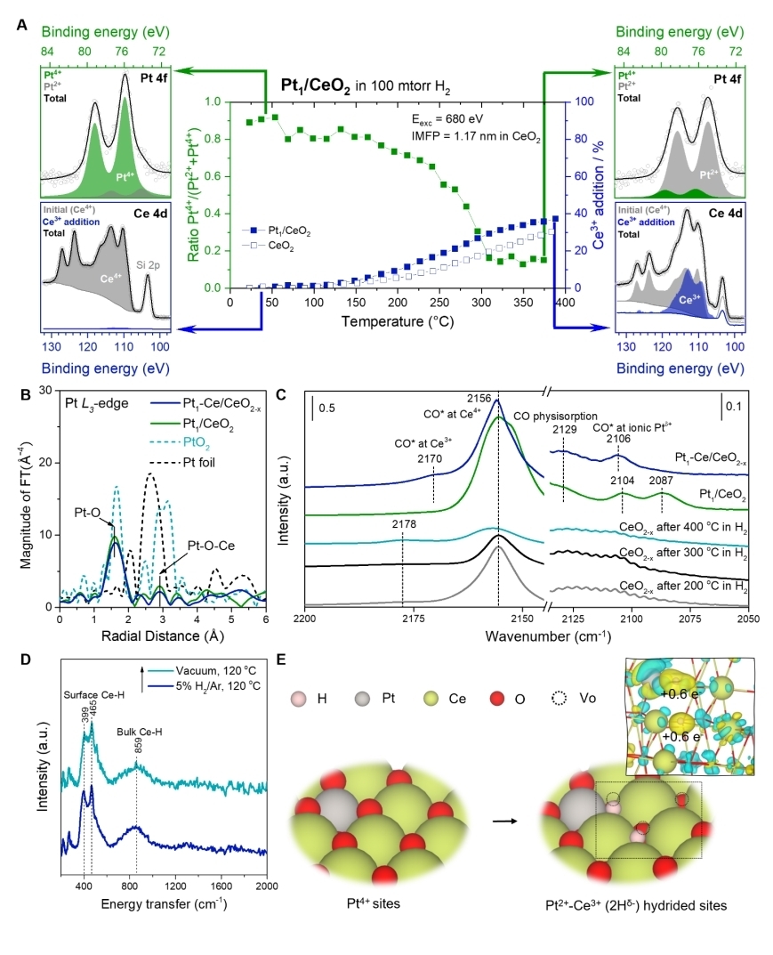 刘家旭教授团队和国际合作者从2019年开始,历时六年时间,经过反复实验及深入研讨,最终通过修饰CeO2上的Pt单位点,设计了了Pt2+-Ce3+(Hδ)氢化中心的形成,其CO氧化反应速率比Pt单位点高出9倍。借助多种原位表征手段结合理论模拟,确定了新的Pt2+-Ce3+(Hδ)氢化中心的结构和形成机理以及CO氧化机理。首次明确提出并证实了这种特定的三元界面活性中心结构,揭示了氢在金属-载体界面上的关键作用,实现了高效且选择性的氧化催化性能。这种新型的氢化反应中心能够显著提高氧化反应的速率(高TOF值)和产物的选择性,克服了传统催化剂在效率和选择性方面存在的瓶颈。界面氢化反应中心的概念可以扩展到负载型金属催化剂,用于许多重要的多相催化反应。
