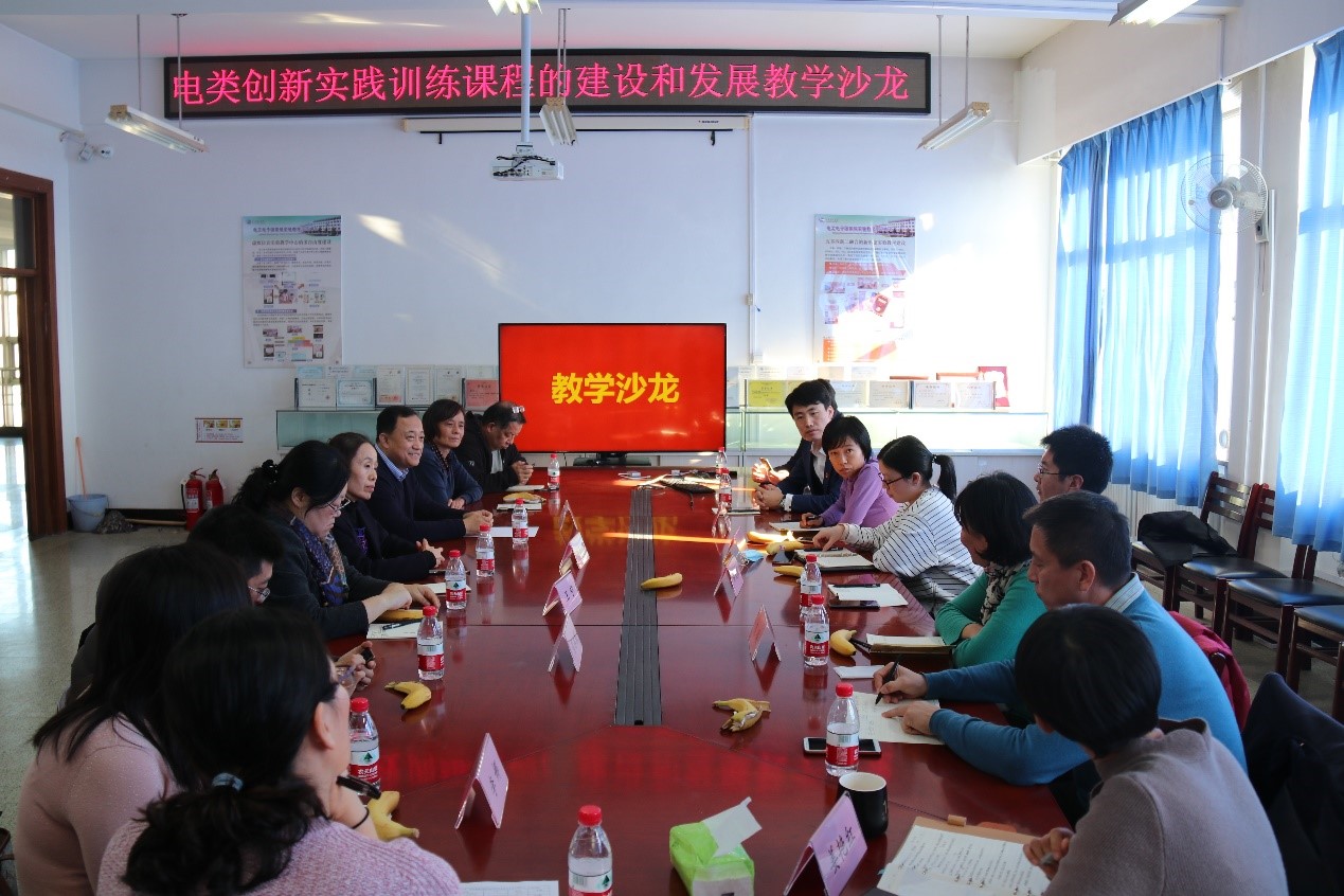 电子信息与电气工程学部副部长郭艳卿教授、信息与通信工程学院副院长李明副教授、电气工程学院副院长王宁副教授、电气工程实验中心主任孙长海教授、开发区校区公共实验中心主任李大奎副教授等实验教学一线教师积极发言,为“电类创新实践训练课程”的建设和发展献计献策,大家围绕作品设计主题、教师扮演角色、课程与大创比赛的关系等展开了深入的交流与研讨。