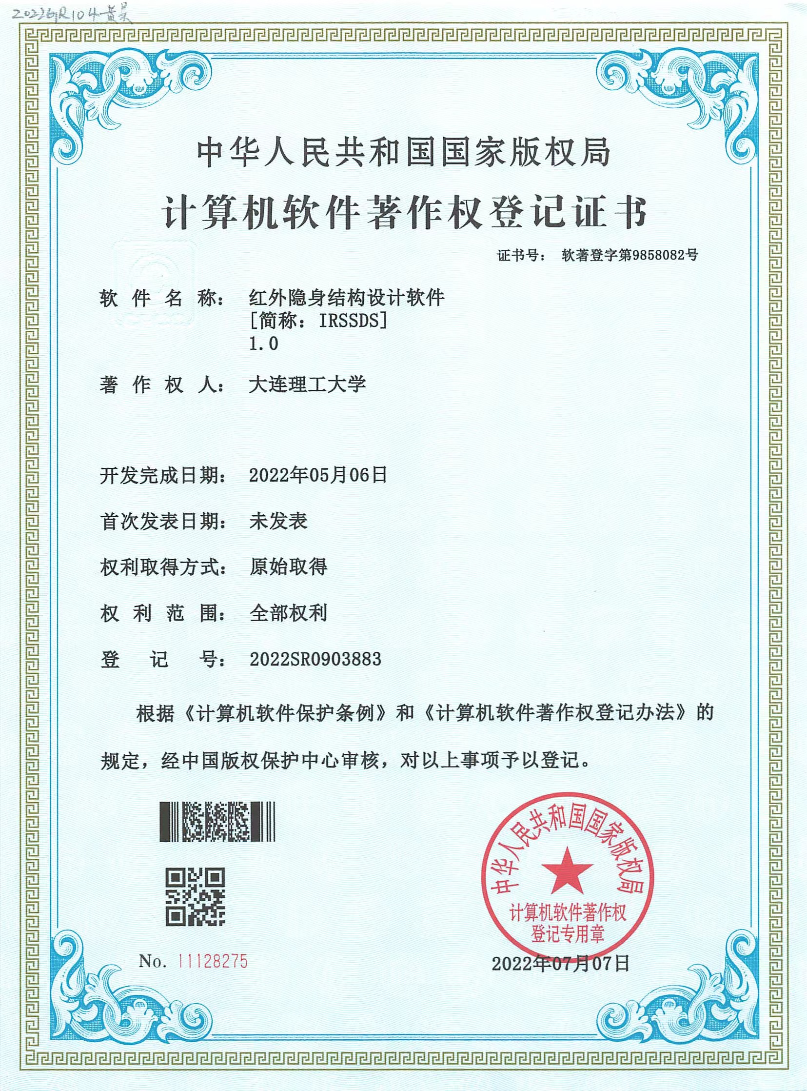 软著:红外隐身结构设计软件, 2022SR0903883, 2022.05.06.