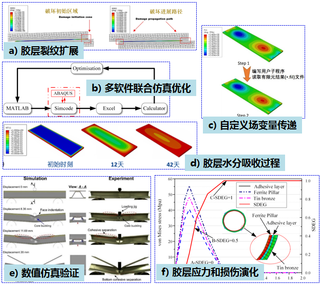 图1 数值建模相关: a) 胶层裂纹演化; b) 多软件联合仿真优化; c) 有限元自定义场变量; d) 水分吸收过程; e) 数值仿真结果验证; f) 内部应力和损伤演化