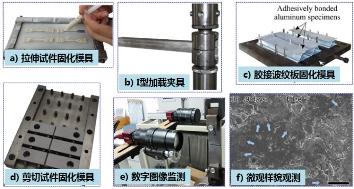 图3 试验测试相关: a) 胶粘剂拉伸固化模具; b) I型加载夹具; c) 胶接波纹板固化模具; d) 剪切固化模具; e) 数字图像监测技术; f) 微观样貌扫描电镜观测