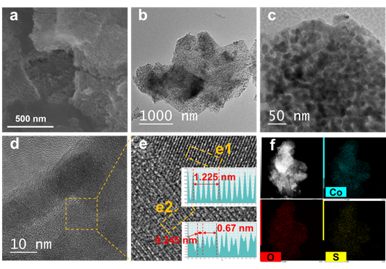 Fig. 1. (a) SEM image of S5-Co3O4. TEM images of S5-Co3O4 with (b) low- and (c and d) high-magnification, and (e) the corresponding crystal lattice. (f) The HAADF-STEM image of S5-Co3O4 and corresponding EDX mapping.