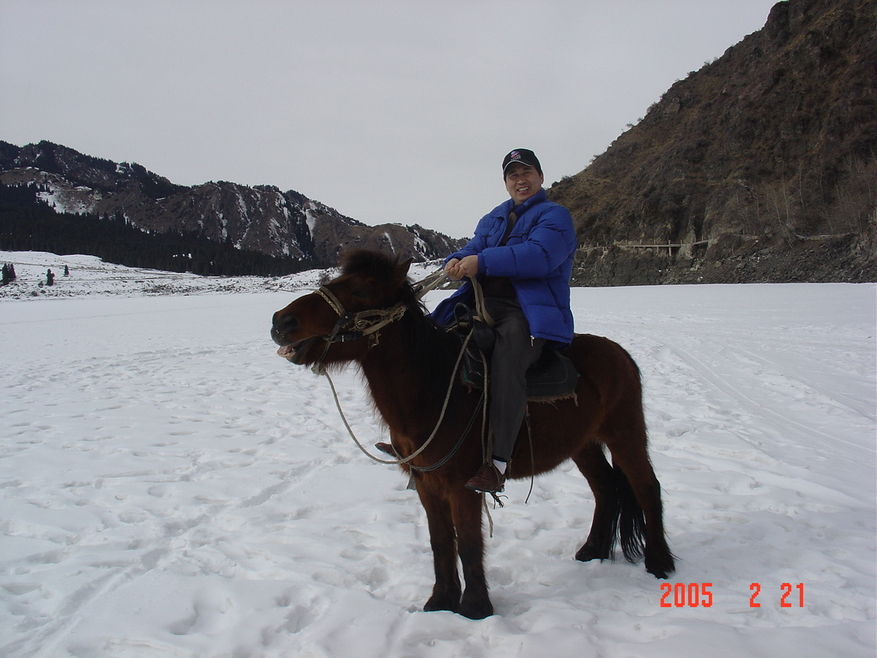 在新疆天池上骑马留念