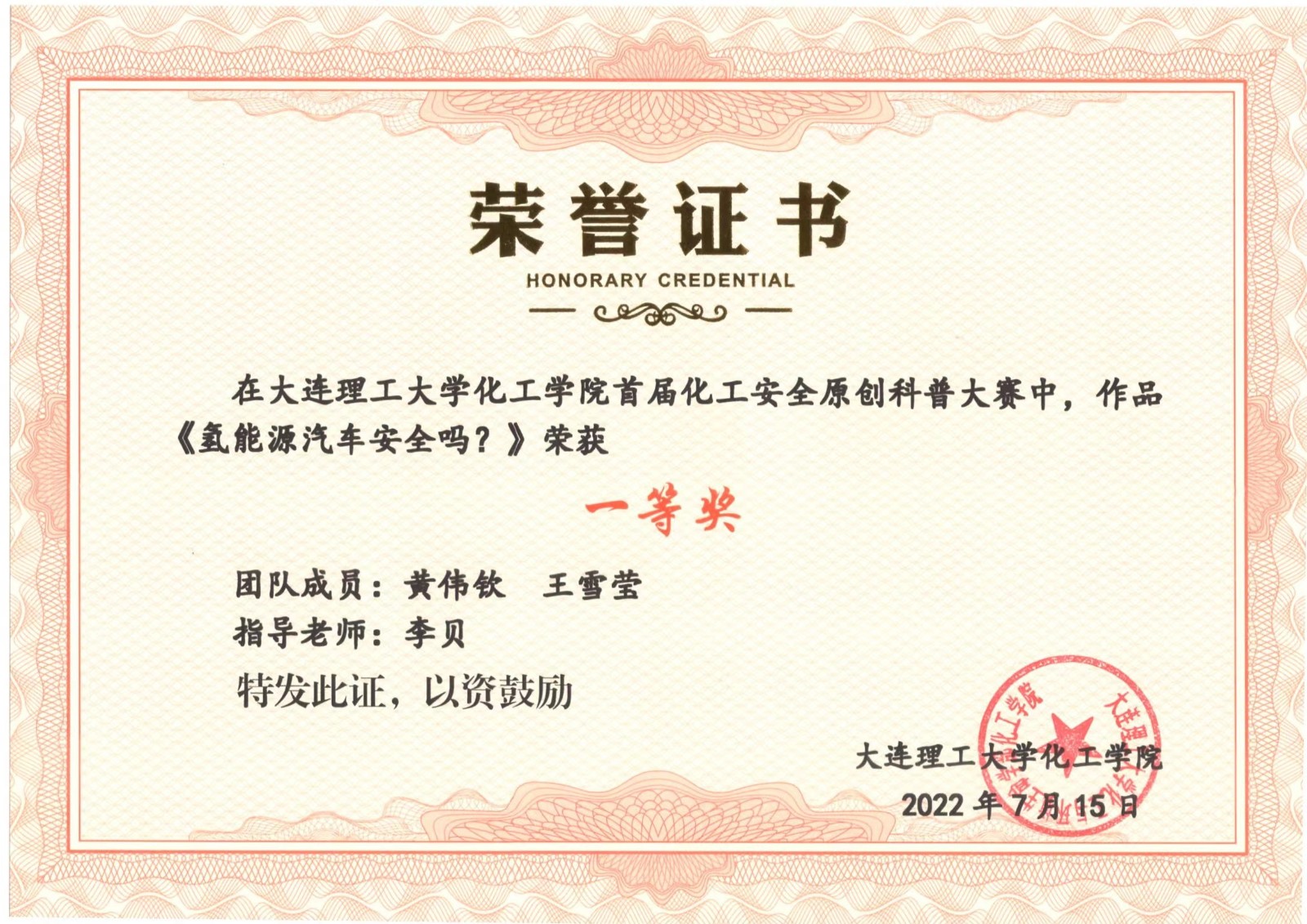 2022年11月,本科生黄伟钦和研究生王雪莹提交的作品“氢能源汽车安全吗?”荣获首届化工安全原创科普作品大赛一等奖,获得1000元奖金,证书和纪念品。为贯彻落实《全民科学素质行动规划纲要(2021—2035年)》,大连理工大学化工安全科普教育基地举办首届化工安全原创科普作品大赛,共征集到来自安全工程、化工工艺、制药工程、高分子材料和过程装备与控制工程专业等21位同学的图文和视频类作品。经活动组委会专家严格评审,共评出一等奖1名,二等奖2名,三等奖3名,优秀奖7名。其中评选出6项优秀作品被推荐至中国消防协会,参加2022年全国优秀消防科普宣传教育作品评选大赛。