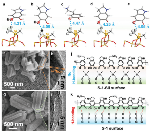 碳材料作为贵金属催化剂的替代品,近年来在储能/转换技术中的应用迅速发展。在本文中,大连理工大学邱介山教授、于畅教授等课题组报道了一种氢键触发组装的策略,通过在多巴胺水溶液中以Silicalite-1为基底来制备空心碳纳米片。值得注意的是,通过结合密度泛函理论建模和实验验证,可以从分子/纳米尺度深入了解材料制备过程中的键合行为本质。结果表明,Silicalite-1表面的Si-OH起着锚定作用,它在能量上有利于通过氢键预吸附聚多巴胺的组成部分,从而触发随后的组装。所制备出具有独特结构的空心碳纳米片可以有效地催化三碘离子还原,转换效率高达8.58%。