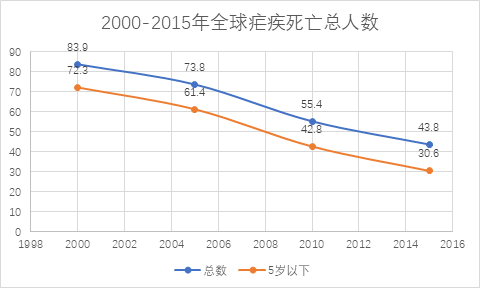 2015年比2000年死亡人数下降48%. 其中儿童因疟致死人数下降58%.