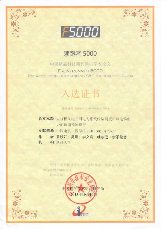 国家科技部F500优秀论文证书