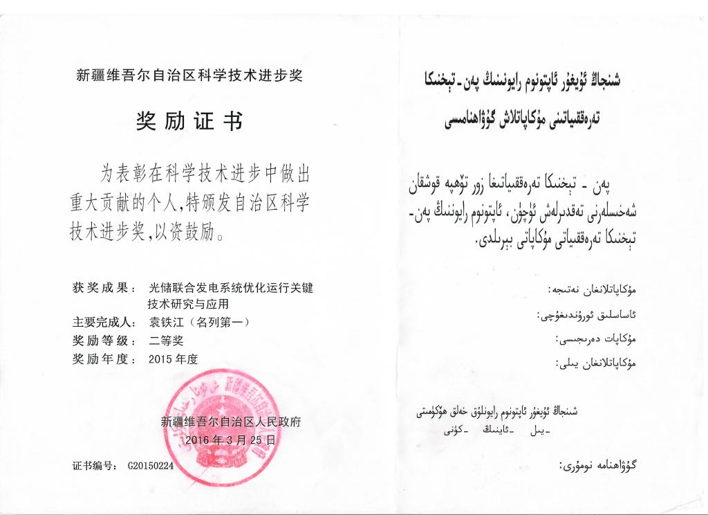 2015年度新疆科技进步二等奖证书
