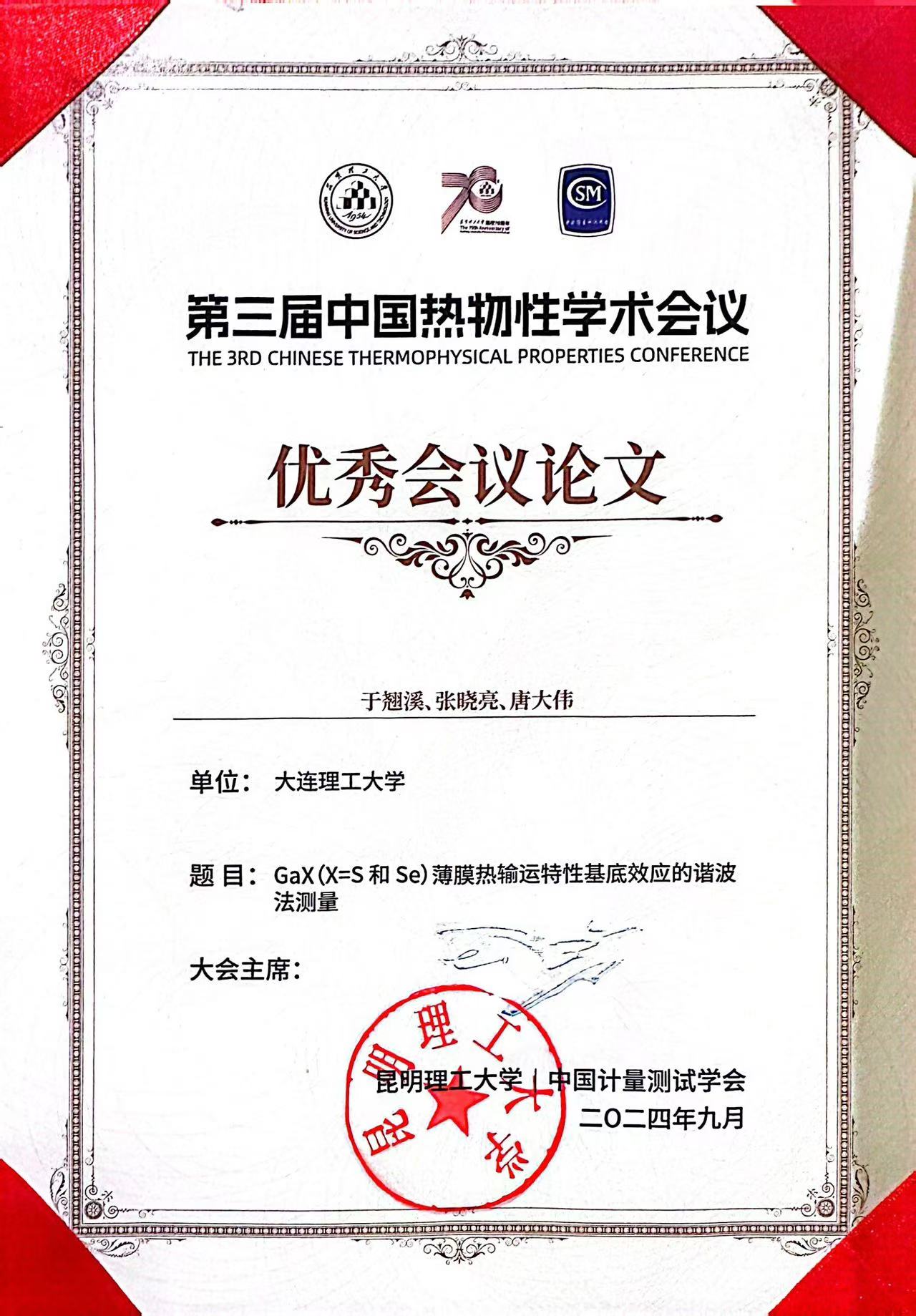 第三届中国热物性学术会议优秀论文奖-于翘溪