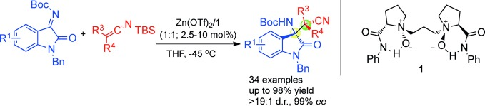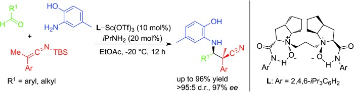 [2] Jiannan Zhao, Xiaohua Liu, Weiwei Luo, Mingsheng Xie, Lili Lin, and Xiaoming Feng* “Asymmetric Synthesis of β-Amino Nitriles through a ScIII-Catalyzed Three-Component Mannich Reaction of Silyl Ketene Imines”Angew. Chem. Int. Ed., 2013, 52, 3473–3477.